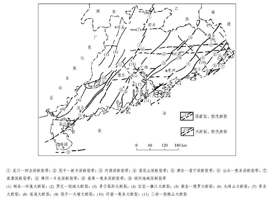 廣東省在大地構(gòu)造上屬華南褶皺系的一部分,其演化過程經(jīng)歷了三個(gè)發(fā)展階段及相應(yīng)的構(gòu)造旋回和構(gòu)造運(yùn)動(dòng):加里東運(yùn)動(dòng)形成緊密線型褶皺,主要呈NEE方向,成為廣東省構(gòu)造骨架的基礎(chǔ);印支運(yùn)動(dòng)形成多方向的過渡型蓋層褶皺;燕山運(yùn)動(dòng)以斷塊造山、NE向和EW向深大斷裂控制的火山噴發(fā)、巖漿侵入為主。深大斷裂對(duì)廣東省的沉積建造、巖漿活動(dòng)、變質(zhì)作用和成礦作用有較明顯的控制。主要的深斷裂有吳川-四會(huì)、恩平-新豐、河源、蓮花山、潮安-普寧、汕頭-惠來(lái)、南澳、佛岡-豐良、高要-惠來(lái)、瓊州海峽等,主要的大斷裂有郴縣-懷集、羅定-悅城、貴子、信宜-廉江、紫金-博羅、九峰山、貴東、遂溪、饒平-大埔、河婆-惠來(lái)、三洲-西樵山等。這些深大斷裂都具有規(guī)模大、活動(dòng)時(shí)間長(zhǎng)等特點(diǎn)。從總體上看。廣東省境內(nèi)大型褶皺和深大斷裂以NE向?yàn)橹鳎g夾EW向和NW向構(gòu)造組成復(fù)雜的構(gòu)造圖景。