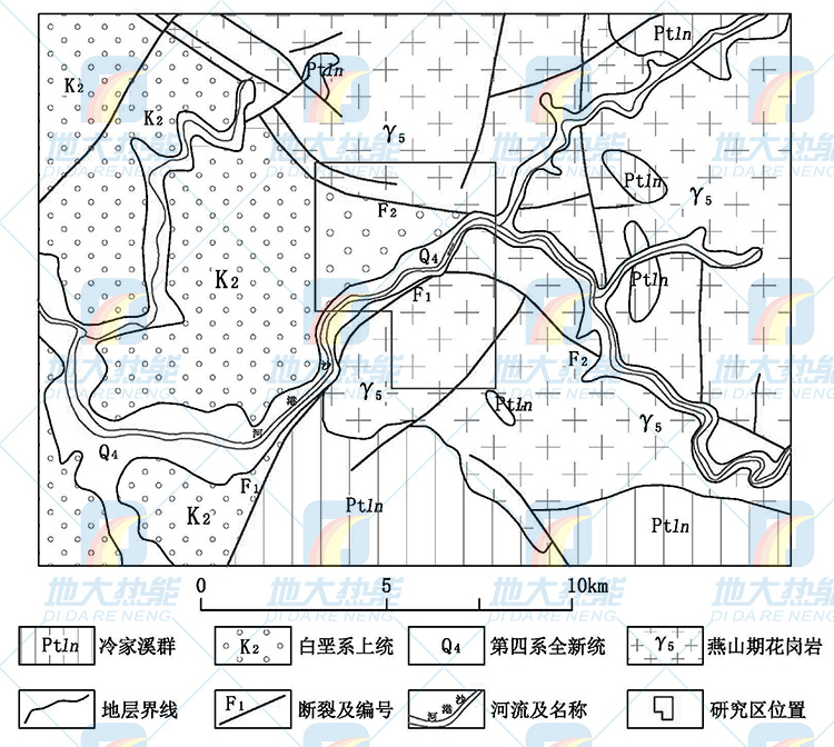 研究區內出露有中生界白堊系上統(K2)、新生界第四系全新統(Q4)地層及燕山期巖漿巖(γ5)。白堊系地層分布于研究區西北部,以公田斷裂(F1)為界,位于斷裂北西(上盤),巖性以紫紅色、灰白色砂礫巖為主,在研究區內與下伏巖漿巖為斷層接觸。第四系(Q4)分布于沙港河及其支流沿岸,上部為黏質砂土,下部為含礫石砂層。巖漿巖分布于研究區東南部及外東側大部區域,位于公田斷裂(F1)南東(下盤),屬于幕阜山巖體,呈巖基狀產出,產出時代為燕山期,同位素年齡為142~160 Ma, 巖性主要為中細粒斑狀二云母二長花崗巖、細粒黑云母二長花崗巖。
