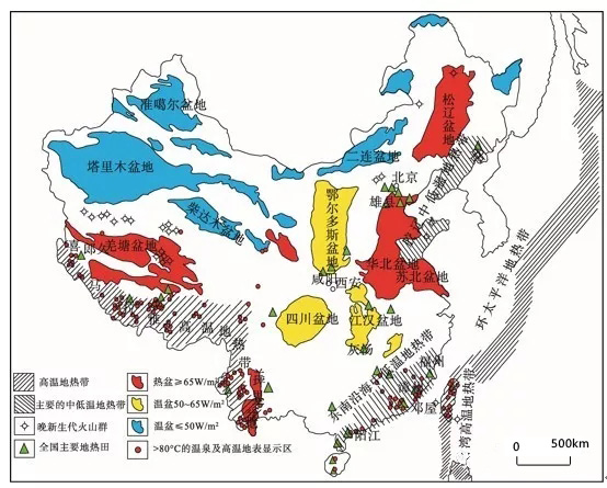 中國東部,高地溫梯度異常區多分布于松遼盆地、華北盆地及東南沿海地區,地溫梯度多在4-5.°C/100m,最高可達7-8°C/ 100m,其分布多呈條帶狀,北東向延伸同地溫分布規律一致。