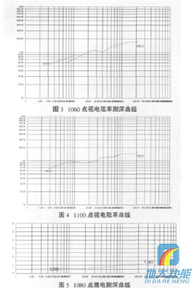 (2)在100線1060、1100點(diǎn)上進(jìn)行電阻率測深, 從二個(gè)點(diǎn)的曲線形態(tài)來看,曲線形態(tài)相似且地層分層明顯;70~200m層位穩(wěn)定,基本為砂巖(見圖3~4)。