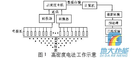 2 工作方法簡述 高密度電法供電為低頻交流電,測量結(jié)果為地層視電阻率,因此實際上屬于直流電阻率法。其工作框圖見圖1。