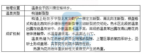 ![]() | 四川康定榆林溫泉風景榆林溫泉在地下10米以內,水溫高達91℃,流出地面的溫度可達到50℃,流量達5L/s。水溫高,壓力大,而且含有多種元素和化合物。 |